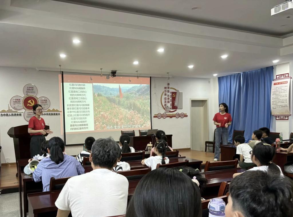 宣讲队员王丹丹等同学为少年儿童热情演绎了《闪闪的红星》电影中潘冬子的故事,带领他们一起学唱电影主题曲《红星歌》。歌曲昂扬向上、雄壮有力,仿佛使听众看到一群革命少年肩扛梭镖、木枪,威武神气地迈着整齐的步伐行进,不仅唱出了少年儿童的天真童趣,也表达出对党的热爱和感激。此外,宣讲队员还邀请他们分享了自己所了解的王二小、小萝卜头、刘胡兰等革命战争时期小英雄的故事,在场听众无不为之动容。