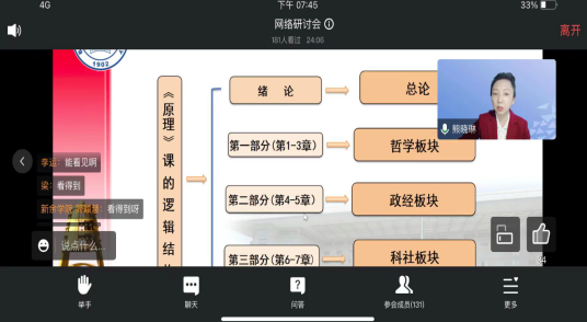 为深入贯彻落实中共中央办公厅、国务院办公厅《关于深化新时代学校思想政治理论课改革创新的若干意见》和中宣部、教育部《新时代学校思想政治理论课改革创新实施方案》等文件精神和要求,纵深推进《马克思主义基本原理》课教学改革和课程建设, 近日,“原理”教研室全体教师以线上会议的方式参加了《马克思主义基本原理》“问题式专题化团队教学改革”集体备课会。此次集体备课会是由全国高校思政课“手拉手”集体备课中心、全国高校思政课名师工作室和江西师范大学涩涩视频