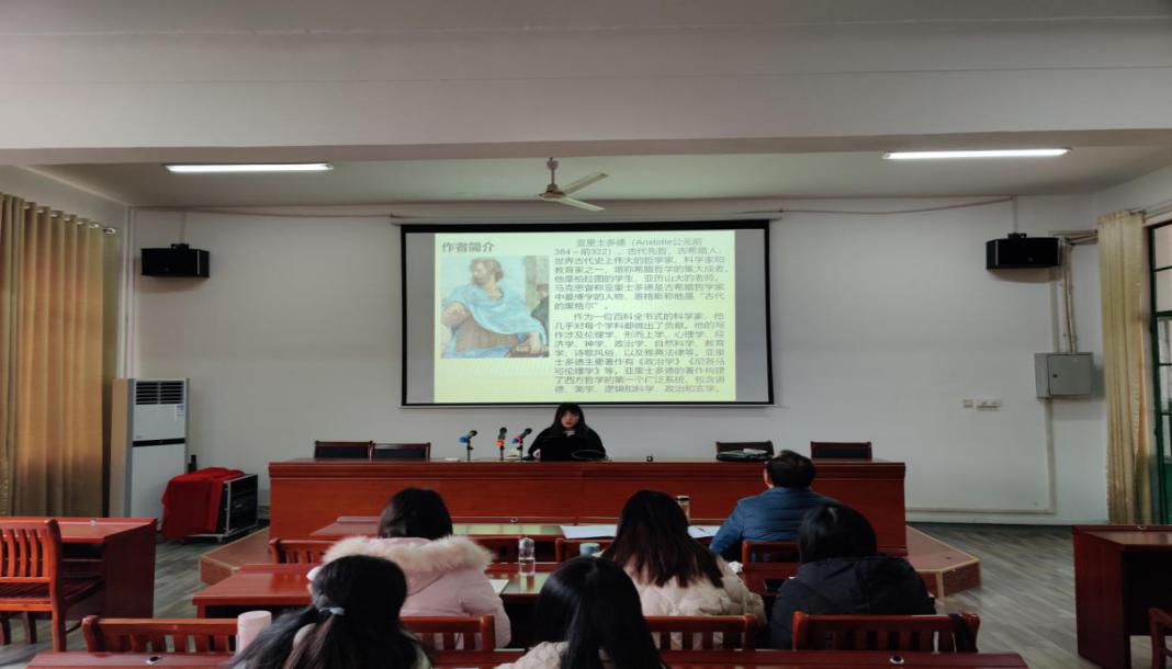 陈默同学选读了亚里士多德的著作《尼各马可伦理学》,并结合自己的研究方向,提出了如何把伦理学优秀的观点和经验融入进当前思想政治教育工作的实际;刘亭同学以《马克思主义哲学史论集》为题,向同学们分享了自己的心得,认为马克思主义哲学史作为一种最完备、最严整的科学世界观和科学的方法论贡献给了人类,特别是给工人阶级以“伟大的认识工具”。傅康同学以《立德树人-大学生思想政治工作创新纪实》为题,结合习近平总书记在思政课教师座谈会上的讲话精神,发表了对高校思想政治教育的看法;陈盼盼同学以著作《毛泽东与莫斯科的恩恩怨怨》为题,从唯物史观、思想政治教育的视角提醒大家“不忘初心”,提出了如何在大学阶段对学生进行责任感教育的新思路。