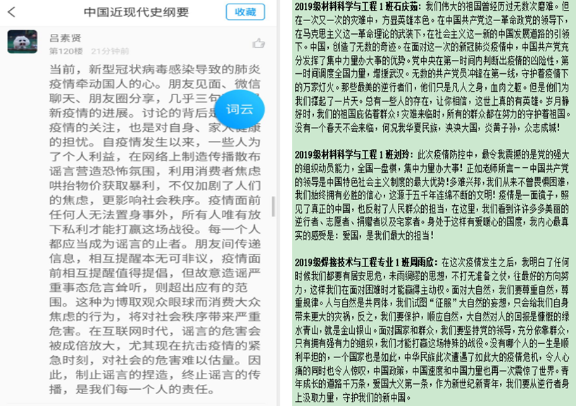 、学工部积极组织思政课教师、学生工作队伍、广大学生通过人民智云客户端、咪咕视频客户端、“学习大国”微信公众号、线上课堂等方式收看由教育部社会科学司、人民网联合举办“全国大学生同上一堂疫情防控思政大课”。直播结束后,各学院通过组织线上课堂讨论、班级征集学习心得、微信分享收看体会等,引导学生加深对课程内容的理解,提升思政大课收看效果。广大师生纷纷表示,从别开生面的思政大课中深刻领会到了“中国精神、中国力量、中国智慧、中国速度”所彰显的社会主义制度优越性,进一步增强了万众一心战胜疫情的信心,也更加坚定了奋发图强、努力进取,为祖国建设贡献青春力量的决心。