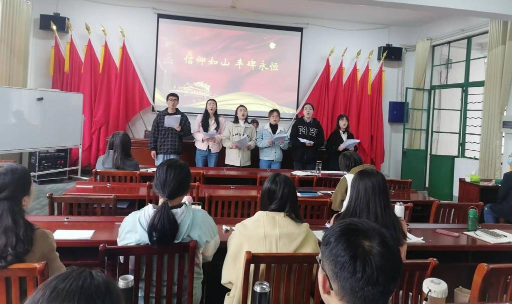 在支部特色工作展示环节。新一届教工党支部支部委员带来了《信仰如山》诗歌朗诵。