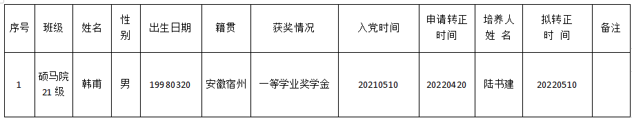 经涩涩视频 研究生党支部研究,拟将韩甫同志转为中共正式党员,现将他的有关情况予以公示,欢迎广大党员、干部、群众通过信函、电话或直接到涩涩视频 研究生党支部或上级党组织反映公示对象在预备期间内的思想品质、现实表现、廉洁自律等方面情况。