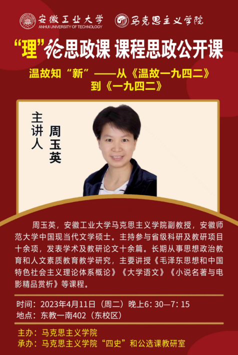 主讲人物介绍:周玉英,涩涩视频 副教授,安徽师范大学中国现当代文学硕士。主持参与省级科研及教研项目十余项,发表学术及教研论文十余篇。长期从事思想政治教育和人文素质教育教学研究,主要讲授《毛泽东思想和中国特色社会主义理论体系概论》《大学语文》《小说名著与电影精品赏析》等课程。