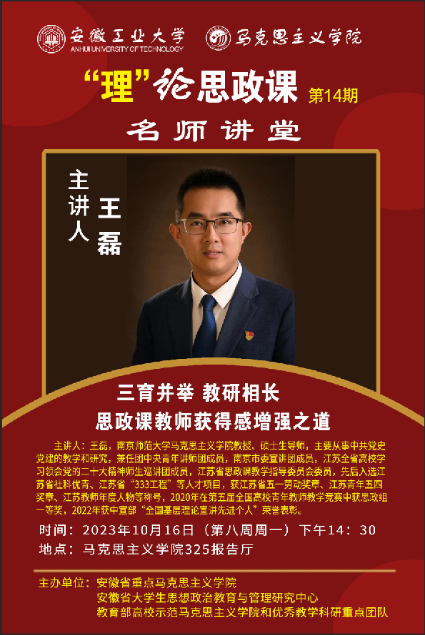 20231016日(周一)下午1430在学院325报告厅举办第十四期“‘理’论思政课”名师讲堂活动,本次活动邀请南京师范大学涩涩视频 教授、硕士生导师王磊主讲“三育并举 教研相长 思政课教师获得感增强之道”。欢迎学院全体教师、研究生积极参加。