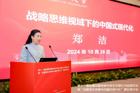 院长郑洁教授、金雅老师和姚礼巧老师受邀参加本次研讨会。郑洁院长应邀作了题为《战略思维视域下的中国式现代化》的主题报告。此次论坛旨在深入学习贯彻党的二十届三中全会精神,深入研究阐释“全面深化改革与中国式现代化”的科学内涵,为进一步全面深化改革、推进中国式现代化贡献智慧和力量。