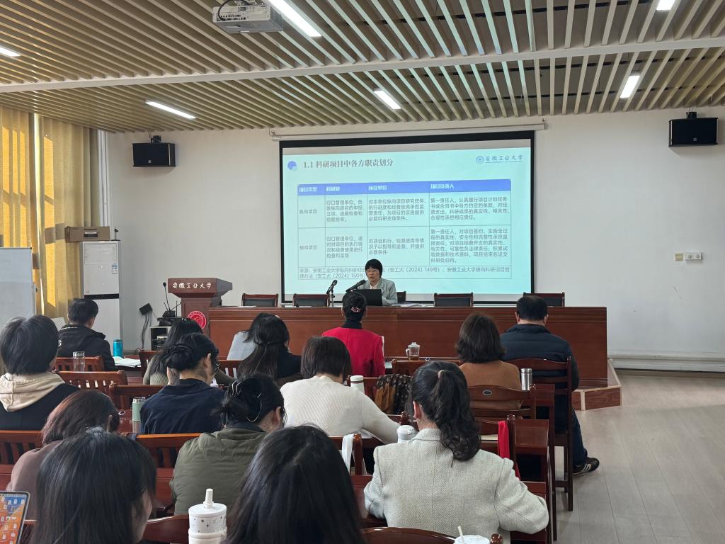 吴金南进行了总结讲话,一方面强调了教师遵守相关科研管理规定的重要性,结合典型案例讲解了在科研经费和项目结项中可能存在的问题;另一方面重点强调了“科研诚信”是一切科研政策的核心价值理念,强调了科研经费的使用必须严格遵守国家、安徽省以及学校相关制度规定。希望教师们要增强责任意识,加强项目管理,确保科研任务高质量完成,共同营造规范有序、求真务实的科研生态。